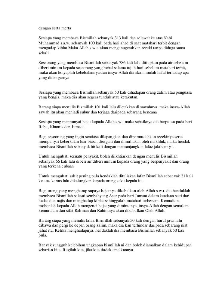Khasiat bismillah 786x, lengkap dgn kunci riyadlohnya (edisi revisi). See more of bismillah786 on facebook. Kemudian saya memberi amalan diatas, minumkan walau sesendok, sisanya kalau bisa diusapkan dikening dan perut. Bismillah 6 dan segala manfaatnya (khasiatnya) bismillah 6 dan berbagai manfaatnya doa yang diajarkan lansung. .bismillah 786, bismillah ki fazilat bismillah ka wazifa for rizq bismillah 786 martba prhny ke fiyde, false belief of imam dairabi, bismillah 786 ustaz muhammad fawwaz, bismillah 786 shaik mohsin70.