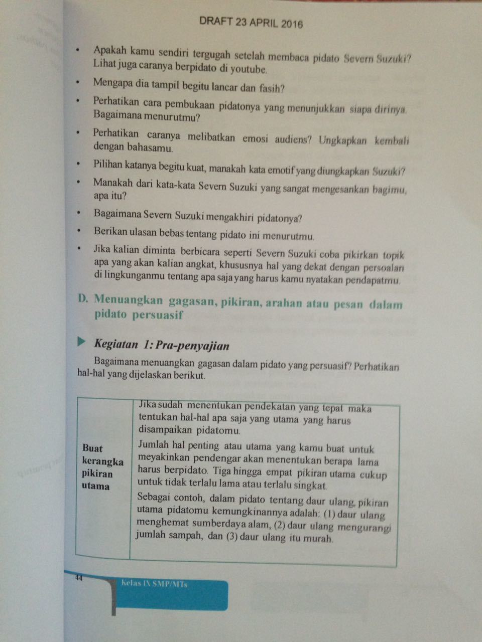 Ucapkan harus lancar dengan memerhatikan intonasi. Apakah kamu sendiri tergugah setelah membaca pidato severn suzuki? Moderator atau pembawa acara, anda harus tampil menarik. Kamu tergugah setelah membaca pidato severn suzuki? Mengapa dia tampil begitu lancar dan fasih?